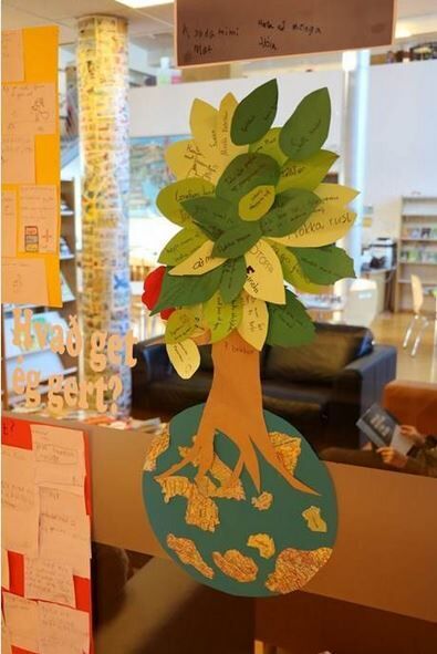 Nemendur svöruðu spurningum á hverjum degi og var afraksturinn hengdur upp á glervegg við bókasafnið.