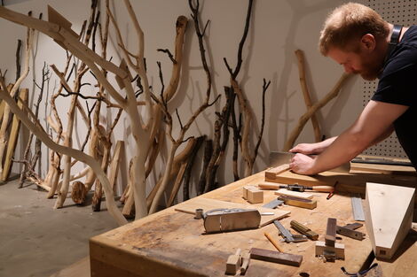 Handverkið leikur lykilhlutverk í að samruninn heppnist og til að undirstrika það hefur Unndór sett verkstæðið sitt upp á safninu. Þar er verkfærum listamannsins gert hátt undir höfði en þau eru forsenda þess að hægt er að móta efniviðinn. Húsgögnin eru unnin á staðnum og birtast eitt af öðru meðan á sýningunni stendur. Þau endurspegla tímann, náttúruna, verkvitið og hugvitið sem þau spretta úr.