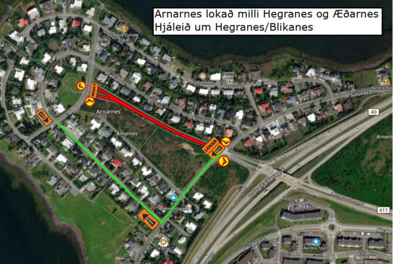 Götukaflinn verður lokaður fyrir alla umferð á meðan framkvæmdum stendur en hjáleið verður um Hegranes/Blikanes, eins og sýnt er á meðfylgjandi lokunarplani.