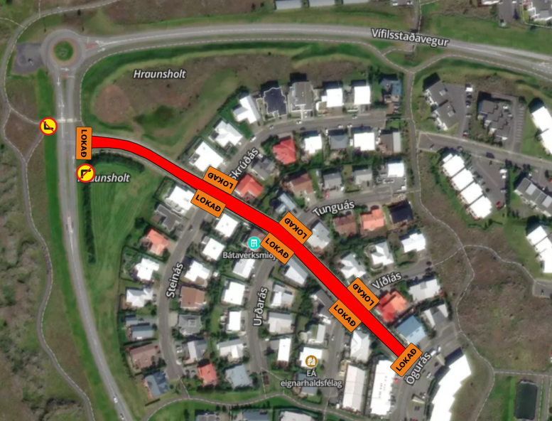 Götukaflinn verður lokaður fyrir alla umferð á meðan framkvæmdum, eins og sýnt er á meðfylgjandi lokunarplani.