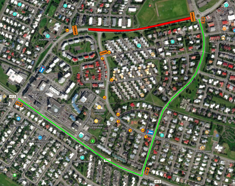 Götukaflinn verður lokaður fyrir alla umferð á meðan framkvæmdum stendur en hjáleiðir verða merktar, eins og sýnt er á meðfylgjandi lokunarplani: