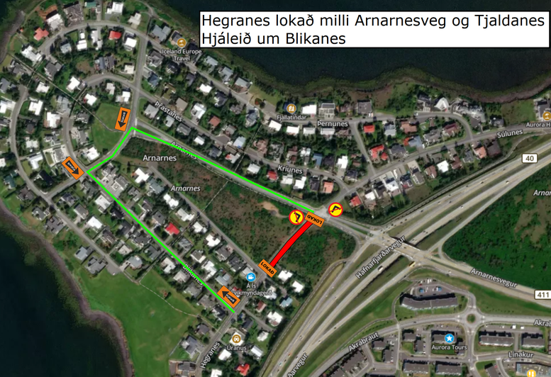 Götukaflinn verður lokaður fyrir alla umferð á meðan framkvæmdum stendur en hjáleiðir verða merktar, eins og sýnt er á meðfylgjandi lokunarplani: