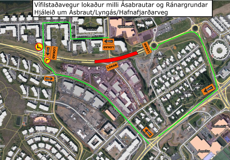 Götukaflinn verður lokaður fyrir alla umferð á meðan framkvæmdum stendur en hjáleiðir verða merktar, eins og sýnt er á meðfylgjandi lokunarplani.