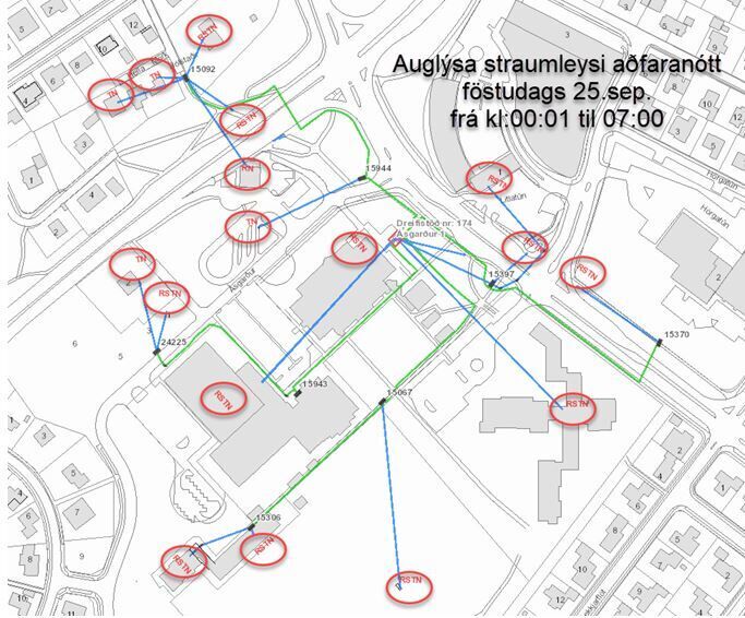 Á myndinni sést hvaða hús verða rafmagnslaus á þessum tíma, þau eru merkt með rauðum hringjum.