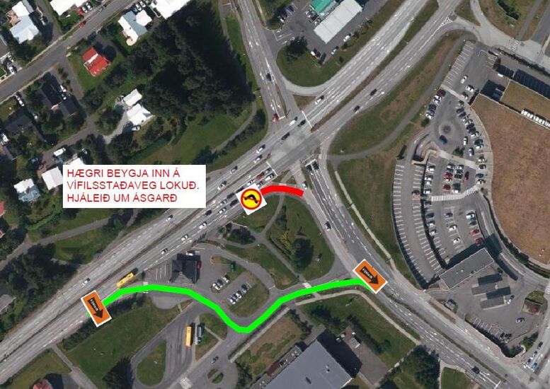 Vegna vinnu við breytingar á gatnamótum Hafnarfjarðarvegar og Vífilsstaðarvegar þarf að loka afrein inn á Vífilsstaðaveg, þ.e. ekki verður hægt að beygja til hægri frá Hafnarfjarðarvegi. Áætlað er að lokunin standi í 3 vikur. Hjáleið verður eins og sést á mynd, í gegnum Ásgarð. Beðist er velvirðingar á þeim óþægindum sem þessi lokun getur valdið.