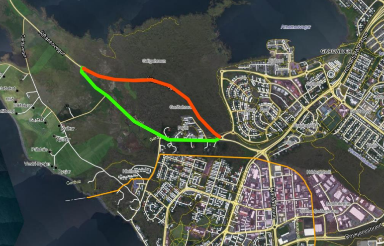 Minnt er á lokun í dag, miðvikudaginn 30. mars þegar Álftanesvegur verður lokaður að hluta fyrir umferð vegna kvikmyndatöku. Hjáleið verður í staðinn um Garðahraunsveg (gamla Álftanesveg) þar sem verður leyft að keyra í gegn á meðan. Gert er ráð fyrir að lokunin á Álftanesvegi standi yfir frá kl.9:00 til kl. 19:00. Á mynd hér fyrir ofan má sjá rauðmerkt þar sem lokun verður og grænmerkt þar sem hægt verður að aka á meðan.