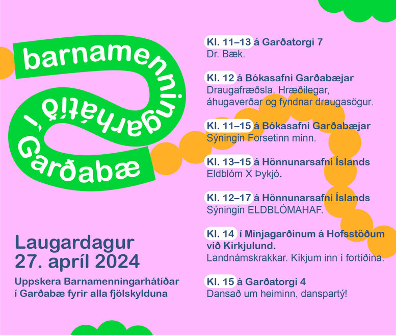 Laugardaginn 27. apríl fer svo fram fjölbreytt dagskrá fyrir alla fjölskylduna sem hefst með ástandsskoðun og þrautabraut frá DR. Bæk sem hefst kl. 11. Klukkan 12 hefst svo Draugafræðsla á Bókasafninu með Björk Bjarnadóttur þjóðfræðingi sem segir hræðilegar, áhugaverðar og fyndnar draugasögur og allir þátttakendur fá afhentan galdrastafinn Salómons innsigli sem er sterk vörn gegn draugum. Allir ættu því að vera öryggir eftir þessa æsispennandi fræðslu. Klukkan 13 hefst svo Eldblómasmiðja í Hönnunarsafninu þar sem Þykó eldblóm verða til úr ullargarni, silkipappír og allskonar fjölbreyttum efniviði. Það eru stöllurnar Sigga Soffía og Sigga Sunna sem leiða smiðjuna en þær tóku einmitt á móti öllum 4. bekkingum í smiðjur og afraksturinn er sýndur á safninu. Í Minjagarðinum á Hofsstöðum gefst svo fjölskyldum færi á að skyggnast inn í fortíðina með Dagrúnu Ósk þjóðfræðingi sem leiðir pælingar um lífið í landnámsbænum sem stóð á Hofsstöðum, dagskráin í Minjagarðinum hefst kl. 14 og í kjölfarið geta fjölskyldur skottast niður á Garðatorg og tekið þátt í danspartýii með Friðriki Agna og Önnu Claessen sem hefst kl. 15.