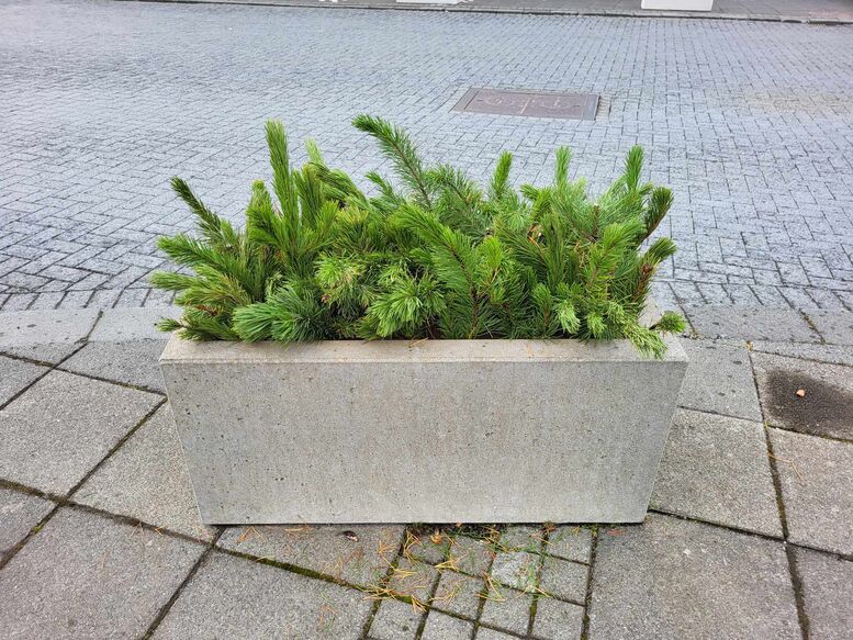 Beitilyng og furugreinar prýða nú blómaker bæjarins. Næsta vor spretta svo upp páskaliljur.
