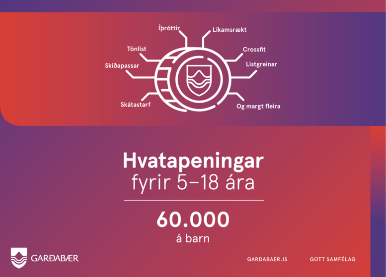 Hvatapeningar ársins 2025 eru 60.000 krónur á barn. Öll börn á aldrinum 5-18 ára, með lögheimili í Garðabæ, fá hvatapeninga. Hægt er að sækja um 15.000 kr. til viðbótar ef tekjur eru undir ákveðnu viðmiði, það er gert í gegnum þjónustugátt Garðabæjar.