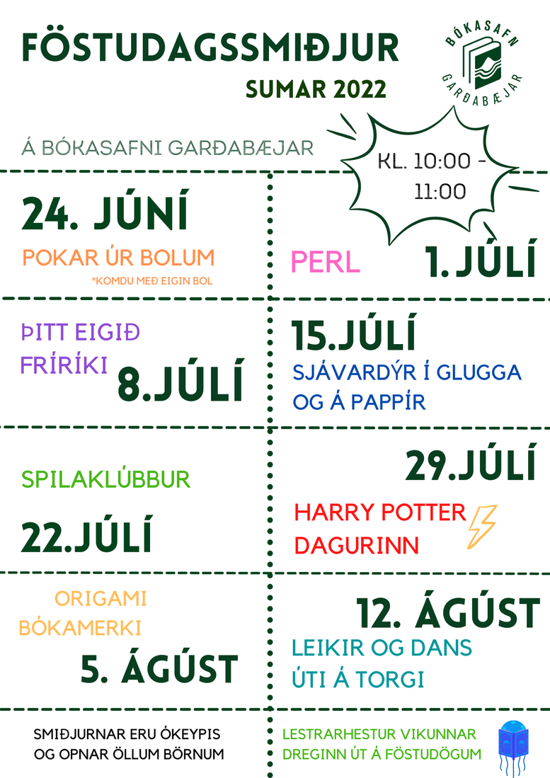 Alla föstudaga í sumar verða í boði fjölbreyttar sumarsmiðjur fyrir börn frá kl. 10-12 í safninu á Garðatorgi. Fyrsta smiðjan var haldin föstudaginn 14. júní og síðasta föstudagssmiðjan verður haldin 12. ágúst. Smiðjurnar eru ókeypis og opnar öllum börnum. Í föstudagsssmiðjunum verður m.a. perlað, farið í fánagerð, föndrað, spilað, hlustað á tónlist og farið í leiki. Hér má sjá dagskrá í föstudagssmiðjunum.