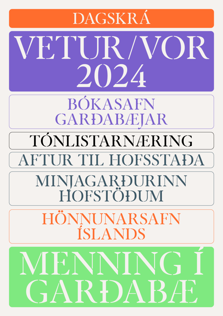 Kynntu þér allt um Tónlistarnæringu, Barnamenningarhátíð, Safnanótt, Jazzþorpið okkar, Aftur til Hofstaða, Minjagarðinn, Hönnunarsafnið og Bókasafn Garðabæjar hér .