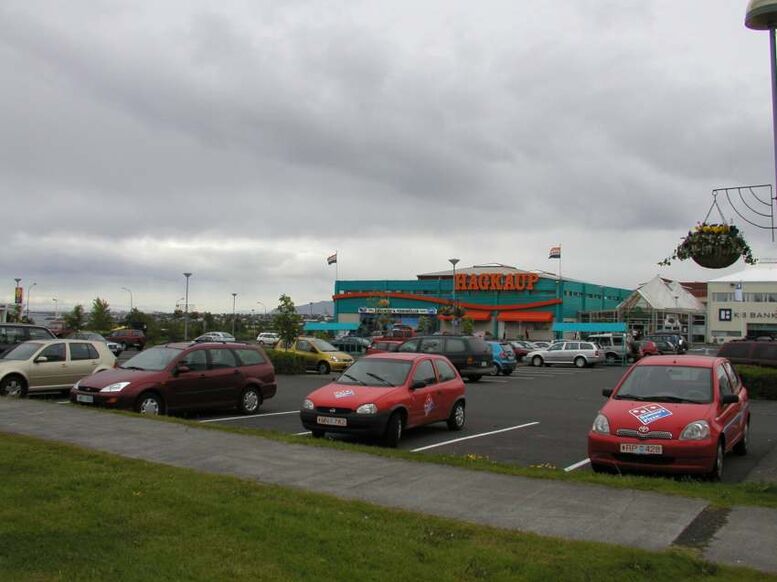 Ein gömul og góð mynd úr safni sem sýnir bílastæðið á Garðatorgi.