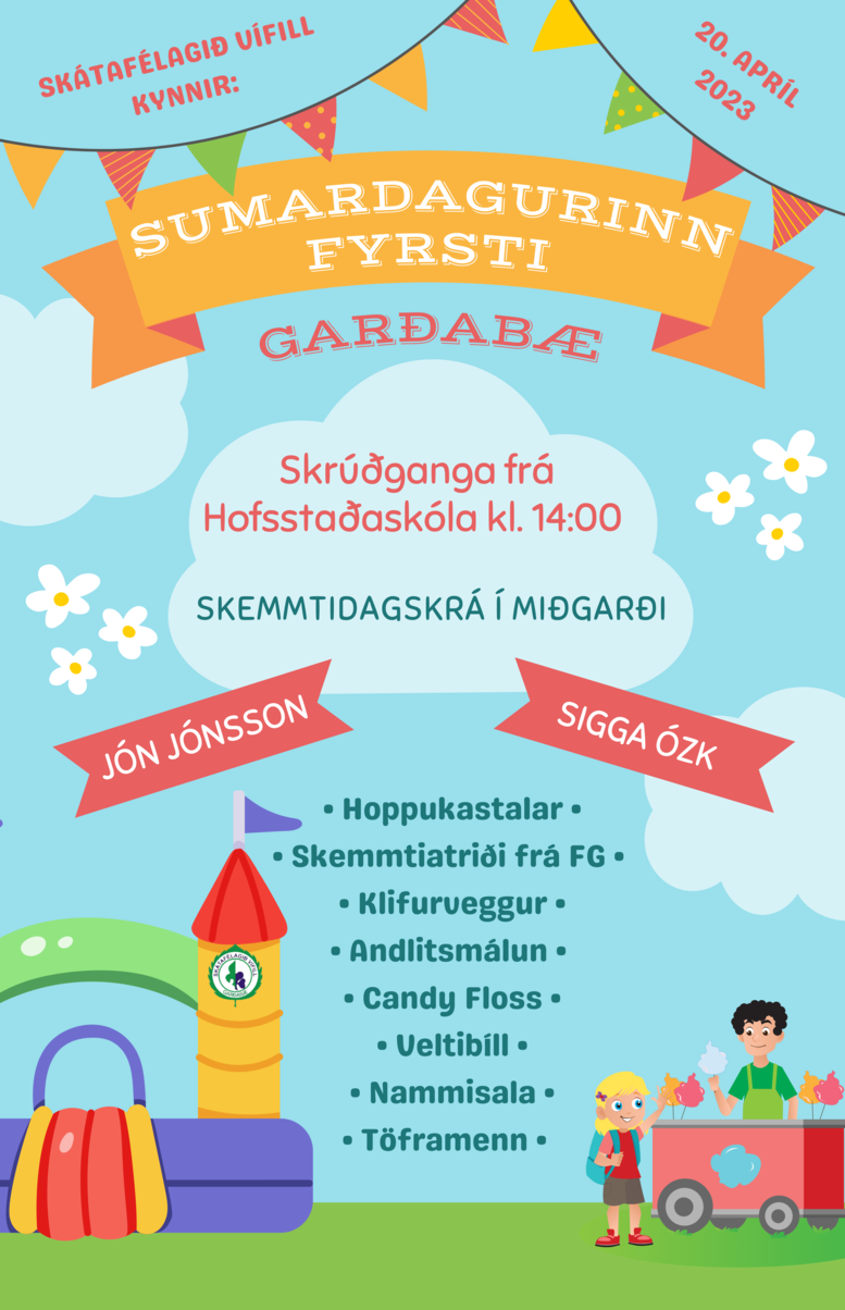 Sumardagurinn fyrsti verður haldinn með pompi og prakt í Garðabæ 20. apríl 2023. Það eru Skátafélagið Vífill og Skátafélagið Svanir sem sjá um hátíðina.