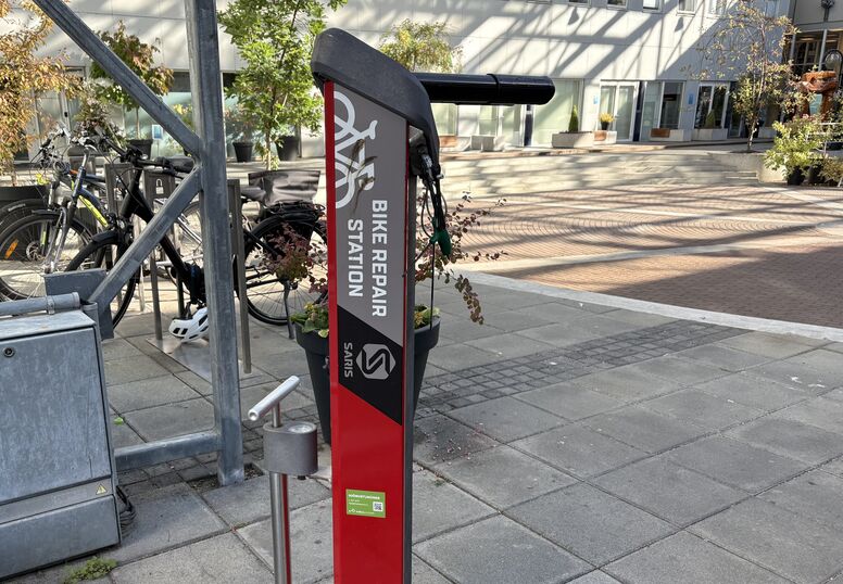 Viðgerðastandurinn á Garðatorgi er vel nýttur af hjólreiðafólki.
