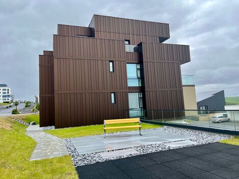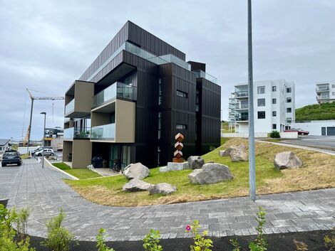 Stéttir og grasflatir tóna vel við glæsilegt hús. Metnaður íbúa er augljós fyrir því að hafa lóð og umhverfi sem snyrtilegast í nýju hverfi í uppbyggingu.