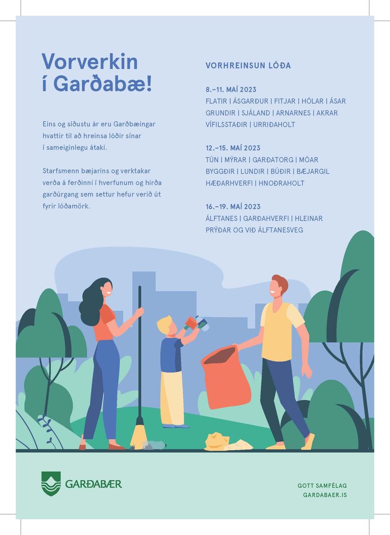 Eins og síðustu ár eru Garðbæingar hvattir til að hreinsa lóðir sínar í sameiginlegu átaki dagana 8-19. maí. Starfsmenn bæjarins og verktakar verða á ferðinni þessa daga og hirða garðúrgang sem settur hefur verið út fyrir lóðamörk.
