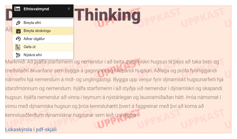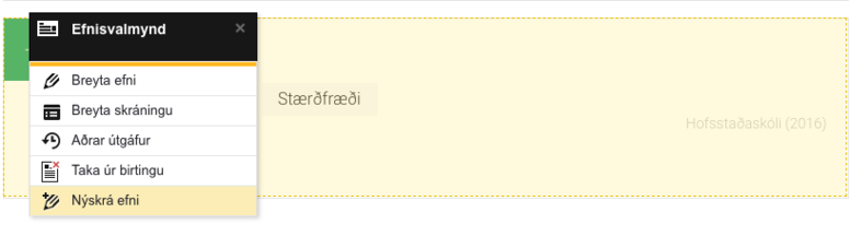 Fyrst er farið á síðu viðkomandi skólastigs. Þar má svo fara með bendilinn yfir einhverja af núverandi færslum og velja að nýskrá efni: