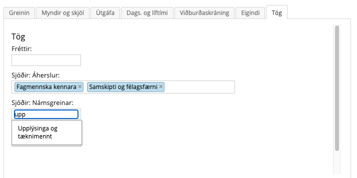 Eftir vistun (og áður en grein er gefin út) er farið í „Breyta skráningu“ til að skrá viðeigandi tög.